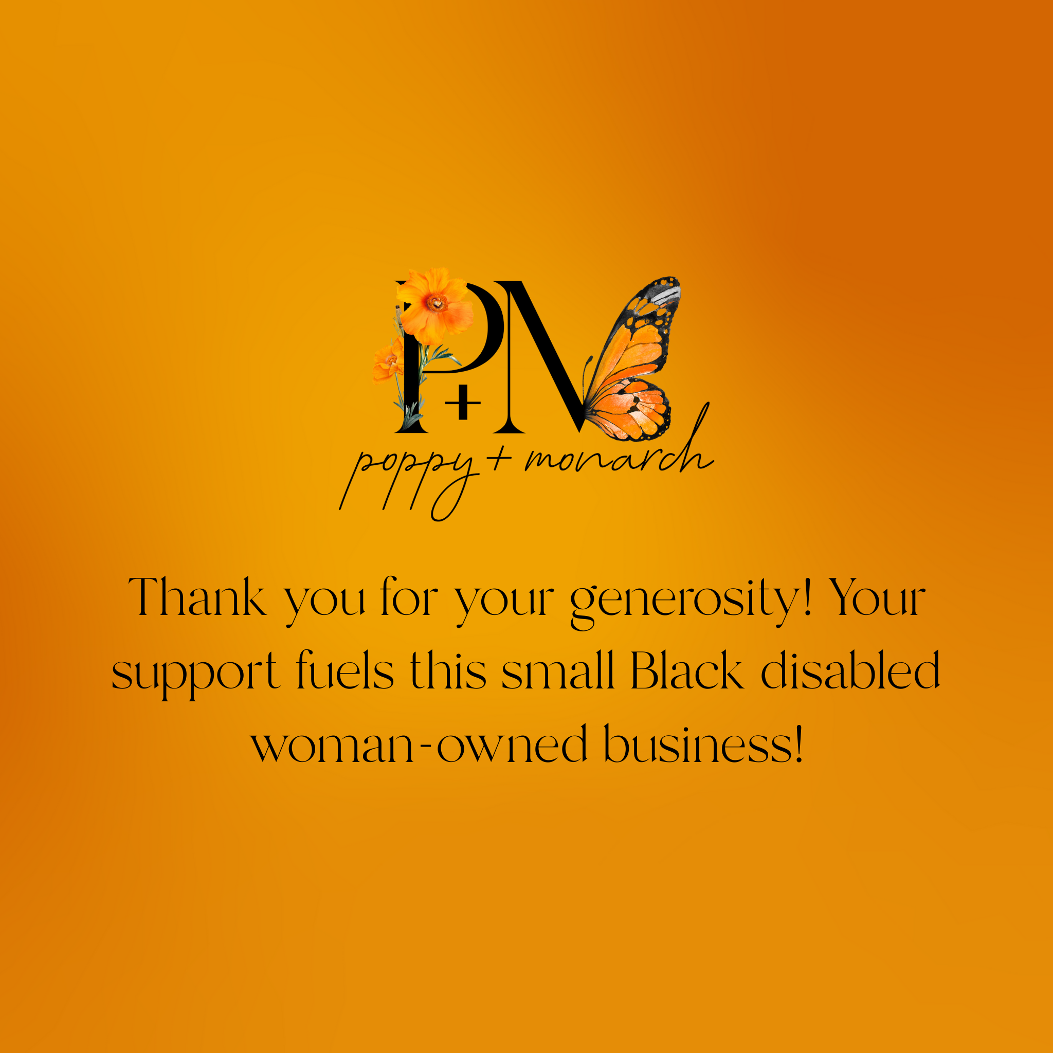 Thank you for choosing Poppy + Monarch to celebrate and honor the chronically ill community. If you have any other questions, please don’t hesitate to contact us!