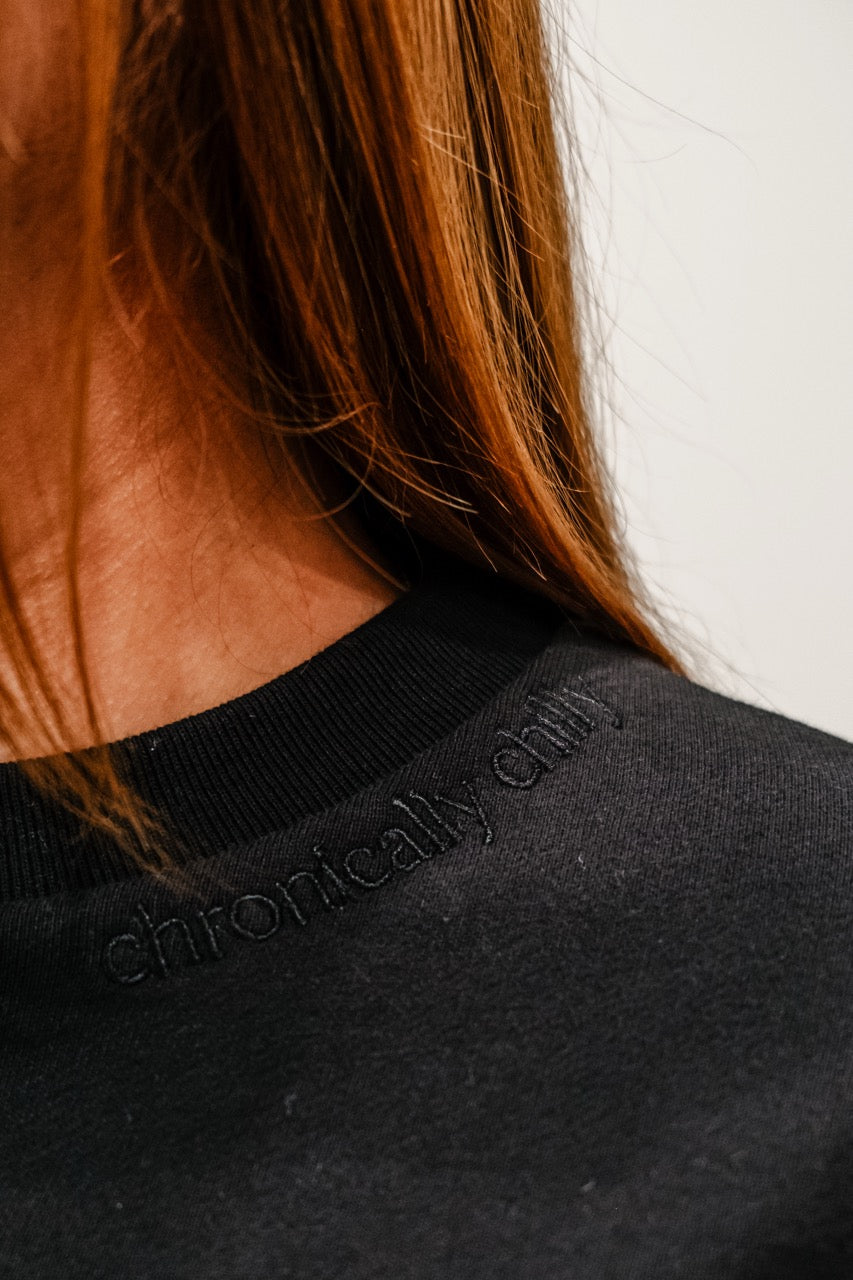 “Chronically Chilly™” collar affirmation – woven at the neckline as a nod to the resilience it takes to thrive with chronic illness.