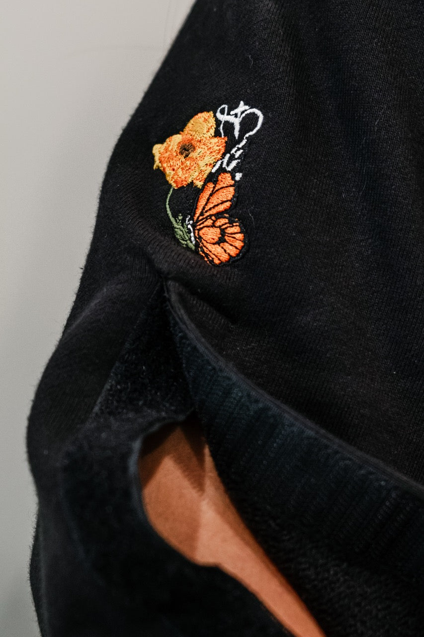 Back design magic – On the back, a delicately embroidered image dances the line between imagination and identity: Some see a butterfly in rest mode, others see a poppy flower blowing in the breeze. Either way, it's a nod to Poppy + Monarch, our name, our essence, and now the signature flourish found on every MRISWTR™.